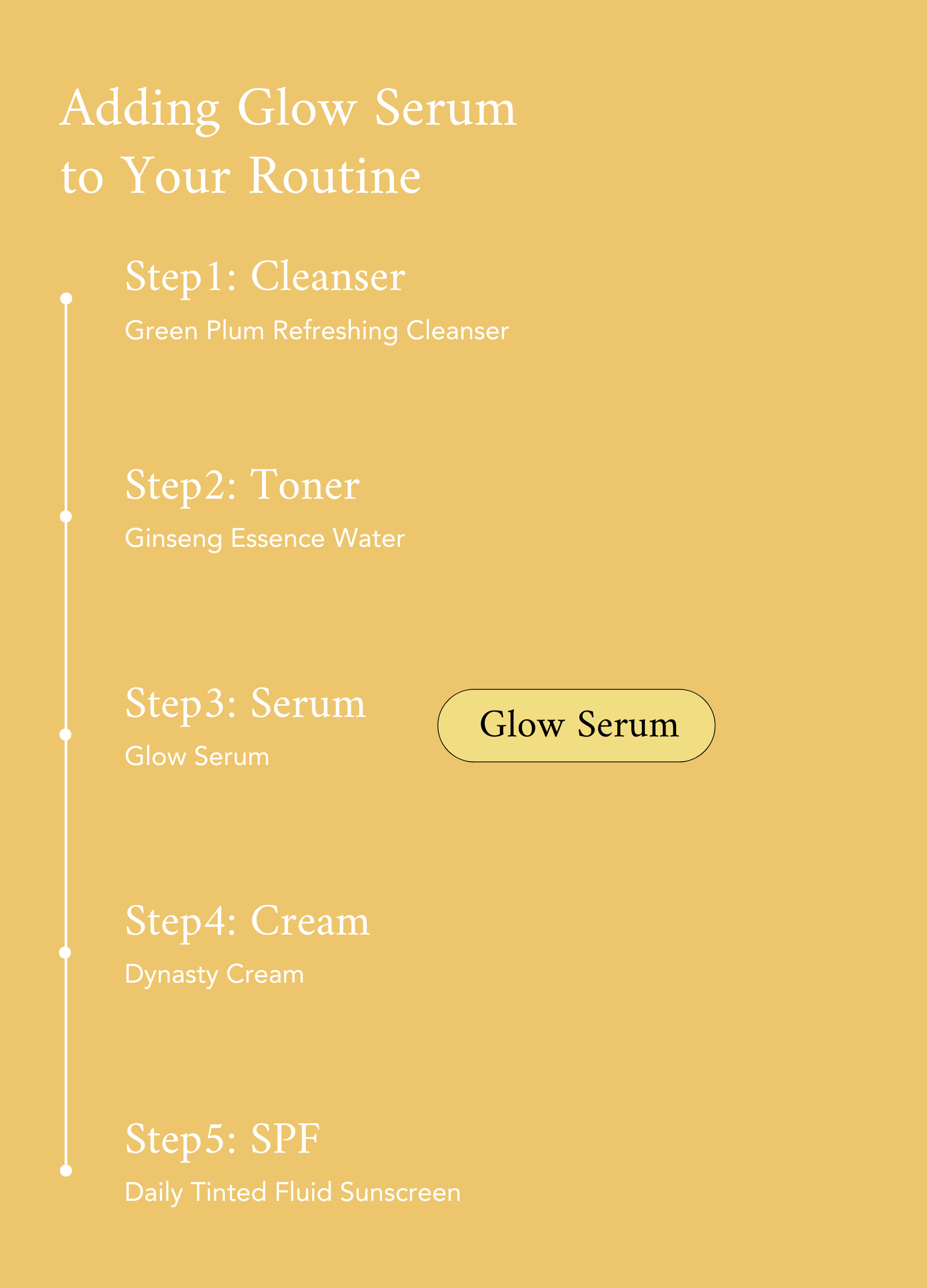 Dispense 2-3 drops of the Glow Serum into the palm of your hand. Apply gently to your face and neck, focusing on areas that need extra hydration or brightness. Tap lightly with your fingertips until the serum is fully absorbed into your skin.